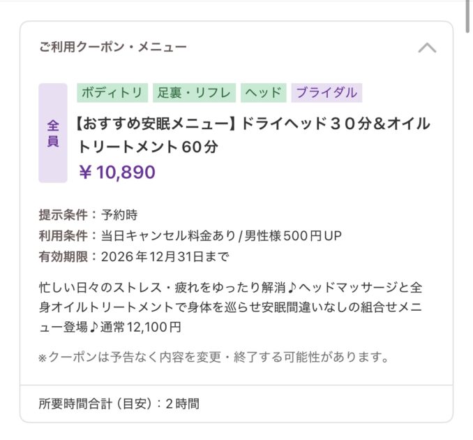 前回と同じメニューで予約しました。