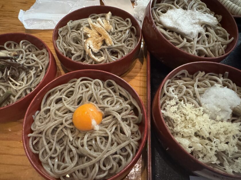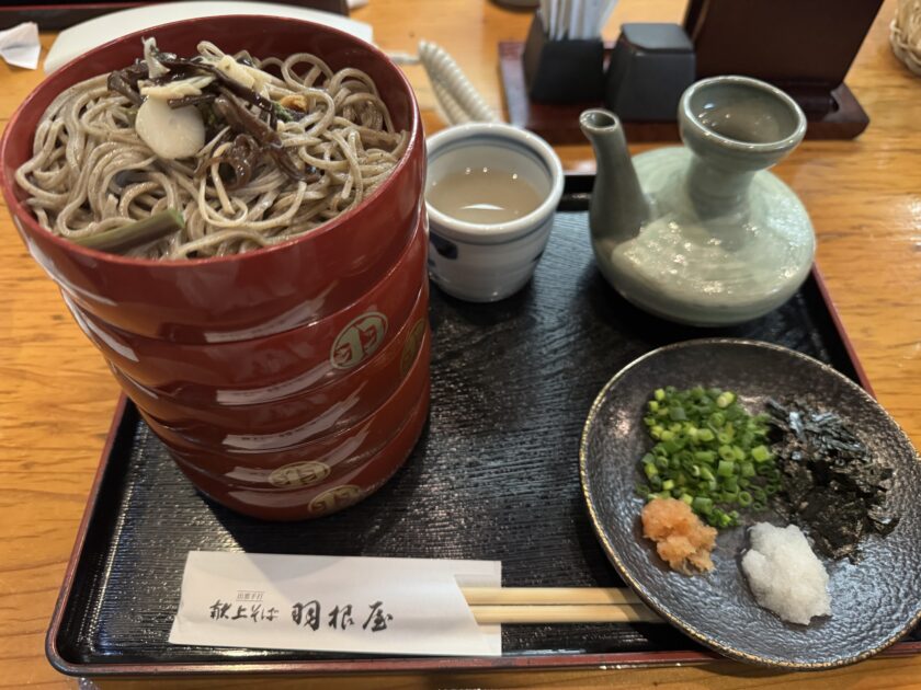 割こそばの食べ方は…重ねられた器のまま、まず一段目のそばに薬味とつゆをかけ、食べ終わったら二段目に残ったつゆと薬味を移して食べる、という食べ方です。