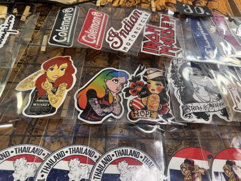 いろんな雑貨屋が並んでいる中、ステッカーとピンを打っているお店を見つけました。