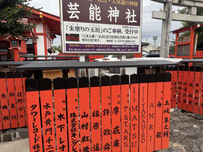 車折神社 投稿者:S.M(代表取締役) 投稿日:2025年10月2日 カテゴリー:2025年9月 出張・取材レポート 関西 車折神社に初めて行ってきました! 車折神社(くるまざきじんじゃ)は、京都市右京区嵯峨朝日町にある神社です。 たくさん名前が書いてある札があって映えますね。 縁結び・推し活守りなどを購入しました! 推し活守りを購入した次の日に推しがアイドルデビューしたのでこのお守り協力かもしれません!! 皆さんも応援している推しがいましたら、ここの推し活守り買ってみてください⸜(*˙꒳˙*)⸝ 映画村 建部神社