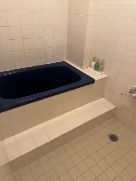 ベッドはダブルベッドなので広々と使えます。お風呂は…ちょっと不気味。