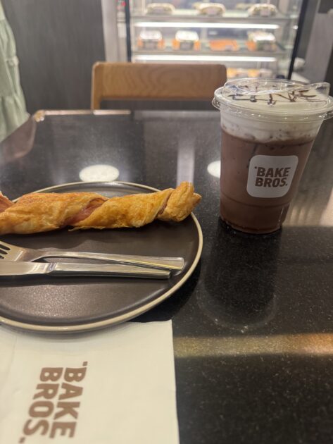 ツイストパンとチョコレートドリンクを注文しました!!セットで25バーツお得だったのでこれにしました。