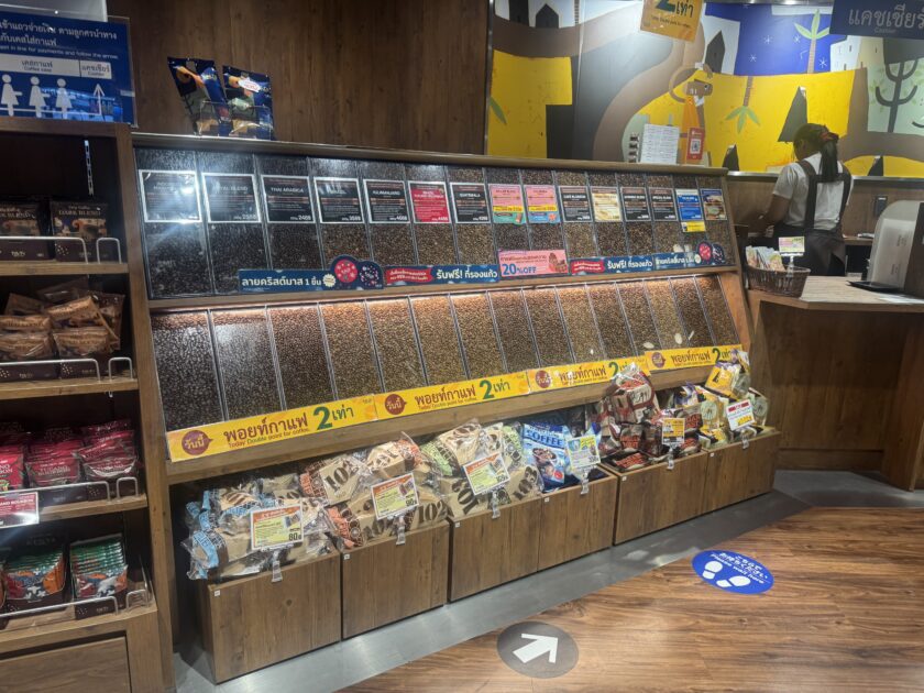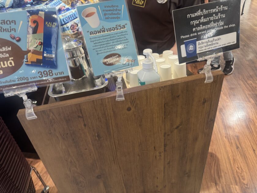 KALDIといえばコーヒーの試飲ですよね。コーヒーを飲みながら店内をうろつく。