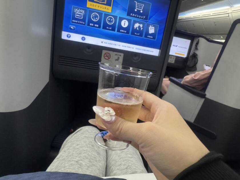 ANAビジネスクラスでの搭乗です。ウェルカムドリンクのシャンパンを朝からいただいてしまいました!