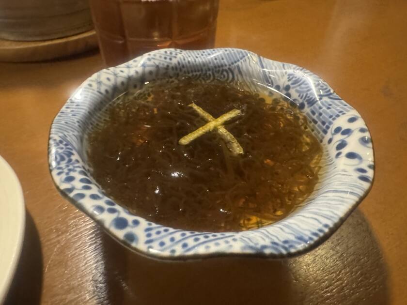 もずく酢ととうもろこしの天ぷらです。もずく酢は400円であまりにも少ない量でした笑