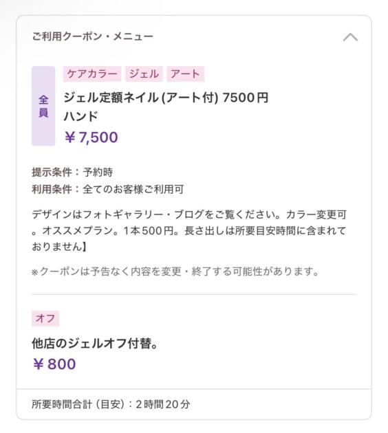 クーポンはホットペッパーのこちらで予約しました!最近デザインを自分で考えるのが面倒なので定額デザインにしています。