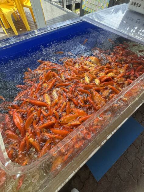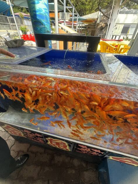 金魚のエサやりはあまりにも恐ろしかったです笑金魚が積み重なっていました笑笑