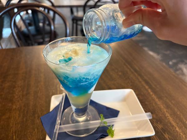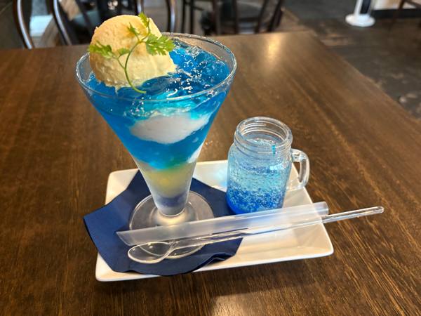 まるで沖縄の海のような綺麗な青が特徴で、幻想的なお料理でした✨