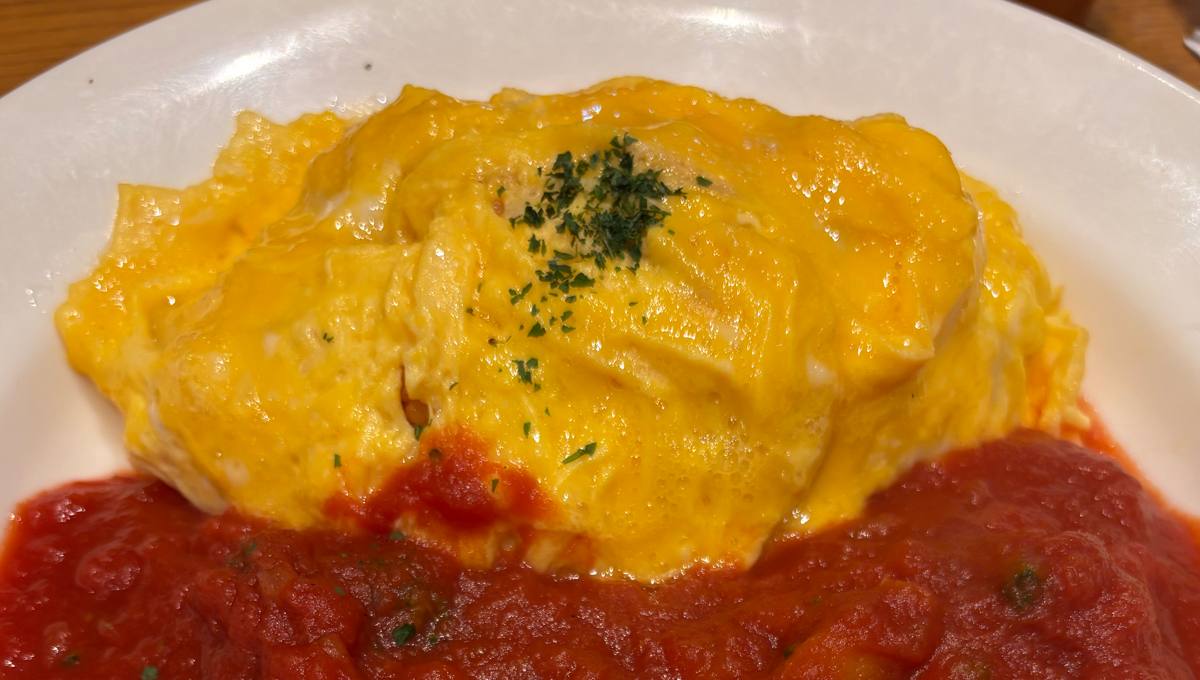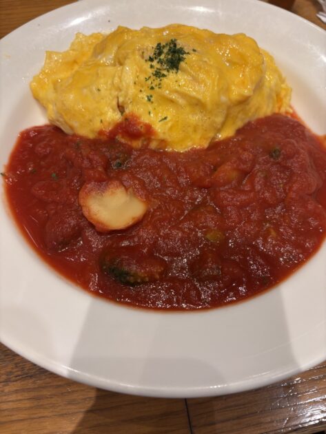 トマトソースが贅沢に使われていてとても美味しかったです!オムライスとトマトソースで二度美味しいですね(*^^*)暑い時期でトマトの季節なので、美味しくいただきました\🍅/余談ですが、こういう閉じられていないオムライスはオープンオムライスと言うそうです。知ってる方の方が多いんでしょうか。私はつい最近知りました😊