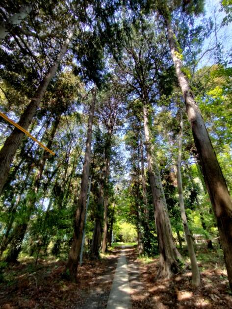樹齢110年前後と推定されるスギの巨木を始め、ケヤキ、クヌギ、コナラなど様々な木達に囲まれた参道は、太陽の光が射し穏やかな風が吹き抜ける心地の良い場所です。この森は天然記念物にも指定されていて、道野辺地区本来の自然の様相がそのまま残っているそう。