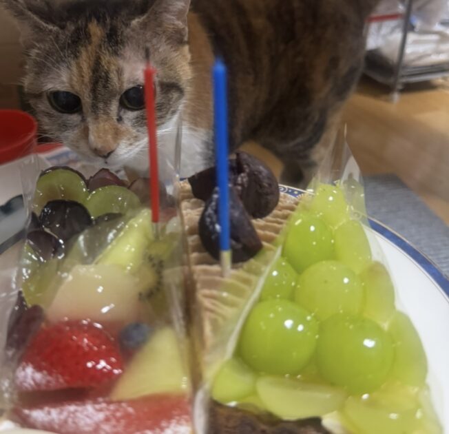 実家の猫ちゃんもケーキを見て黒目を大きくしてたので、クリームを少し食べさせたらとても喜んで食べてました!