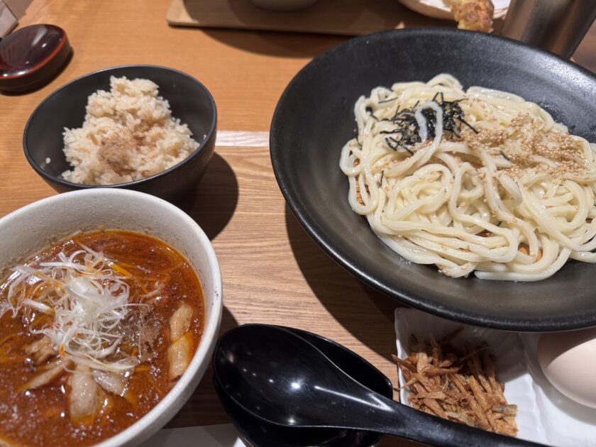 ピリ辛のつけ汁がうどんに合います!お肉もたくさん入っているので、だしごはんと合わせていただくととても美味しかったです😋